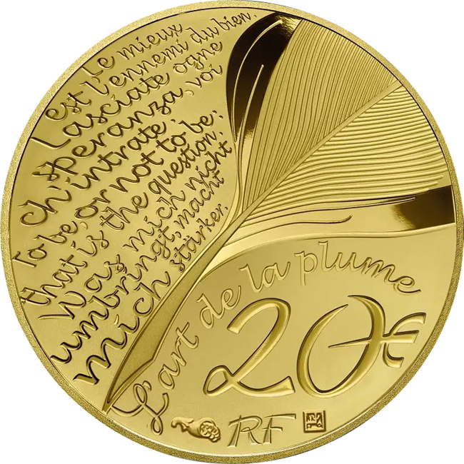Rubová strana je společná pro celou sérii Art of the Quill. Lze si přečíst několik ikonických citátů, jako je Voltairův Le mieux est l?ennemi du bien, Dante Alighieri Lasciate ogne speranza voi ch'intrate, Být či nebýt: to je otázka Williama Shakespeara nebo Nietzscheho Was mich mich nichtm?. Uprostřed mince je vyryto pírko a pod ním je název série. Ve spodní části mince je akronym RF spolu s puncem Joaquina Jimeneze a rytecké dílny.